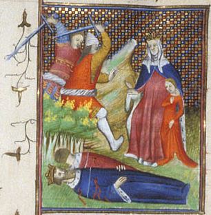 Londra, British Library, Royal 20 C V, f. 97r. Olimpiade, sorretta da due giovani ancelle, accusata di aver assassinato il re Filippo Arrideo affronta i carnefici mandati da Cassandro.