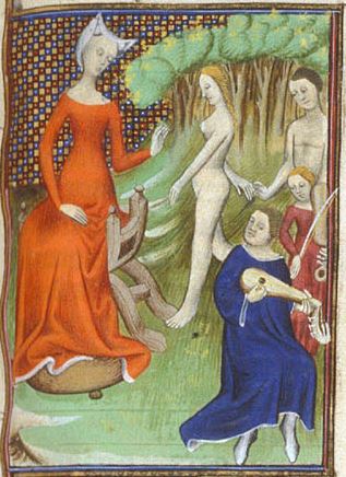 Londra, British Library, Royal 20 C V, f. 101r. Flora siede sul trono; due personaggi suonano mentre un uomo e una donna danzano nudi.