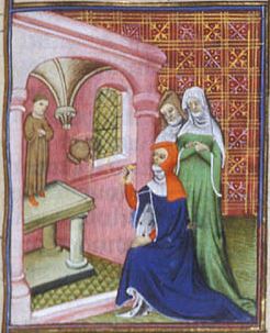 Londra, British Library, Royal 20 C V, f. 105r. Sulpicia, accompagnata da due devote, consacra con dell'incenso la nuova statua nel tempio di Venere.