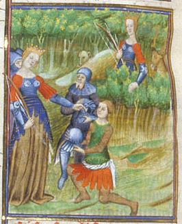 Londra, British Library, Royal 20 C V, f. 152v. Due soldati rendono omaggio a Zenobia; Zenobia si reca a caccia di cervi e orsi.