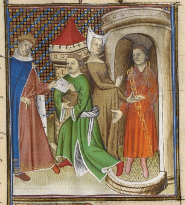 Londra, British Library, Royal 20 C V, f. 161v. Camiola paga il riscatto per il principe Rolando.