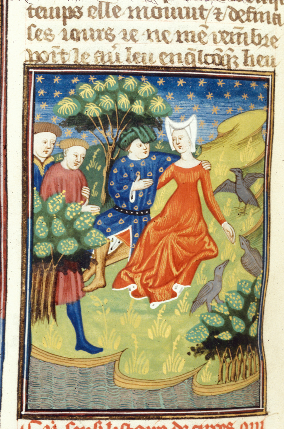 Londra, British Library, Royal 16 G V, f. 42v. Circe siede abbracciata ad Ulisse, sulla sinistra sono due uomini dell'equipaggio e sulla destra due corvi (due uomini trasformati?).