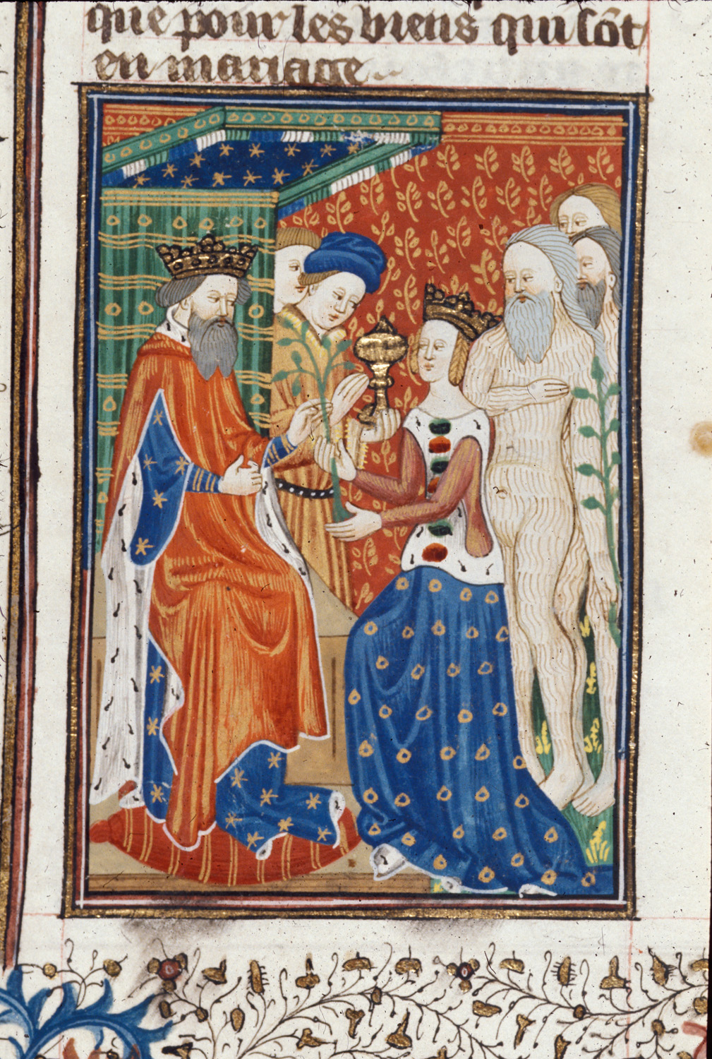 Londra, British Library, Royal 16 G V, f. 53v. La regina di Saba Nicaula, accompagnata da un gruppo di uomini raffigurati come selvaggi, offre al re Salomone un ramo di balsamino.