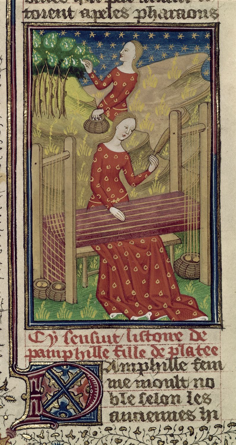 Londra, British Library, Royal 16 G V, f. 54v. Panfila raccoglie la seta; Panfila tesse un panno al telaio con le fibre raccolte.