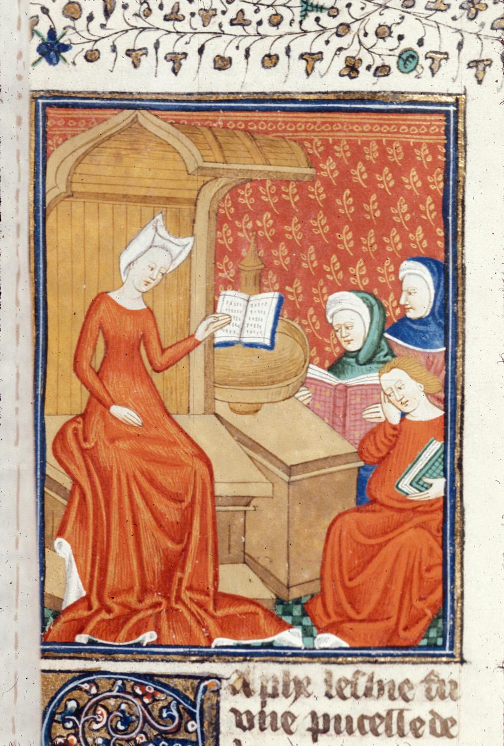 Londra, British Library, Royal 16 G V, f. 57r. Saffo, seduta in cattedra, legge un volume a due uomini e una donna.