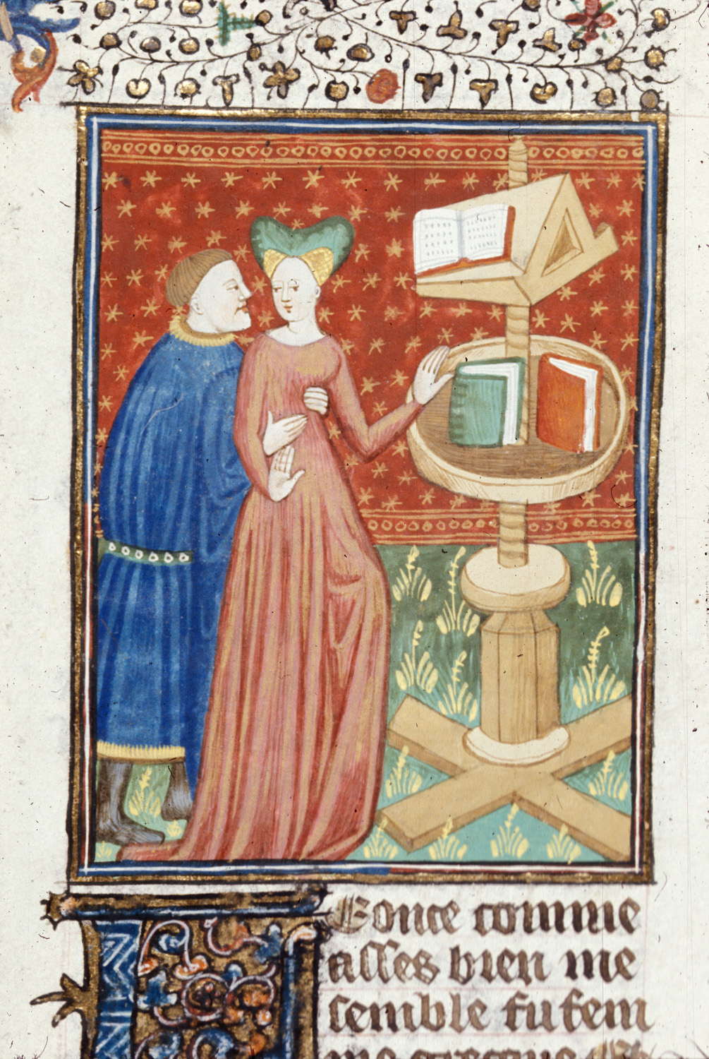 Londra, British Library, Royal 16 G V, f. 74r. Leonzio, in piedi accanto ad un leggio, viene abbracciata da un ammiratore.