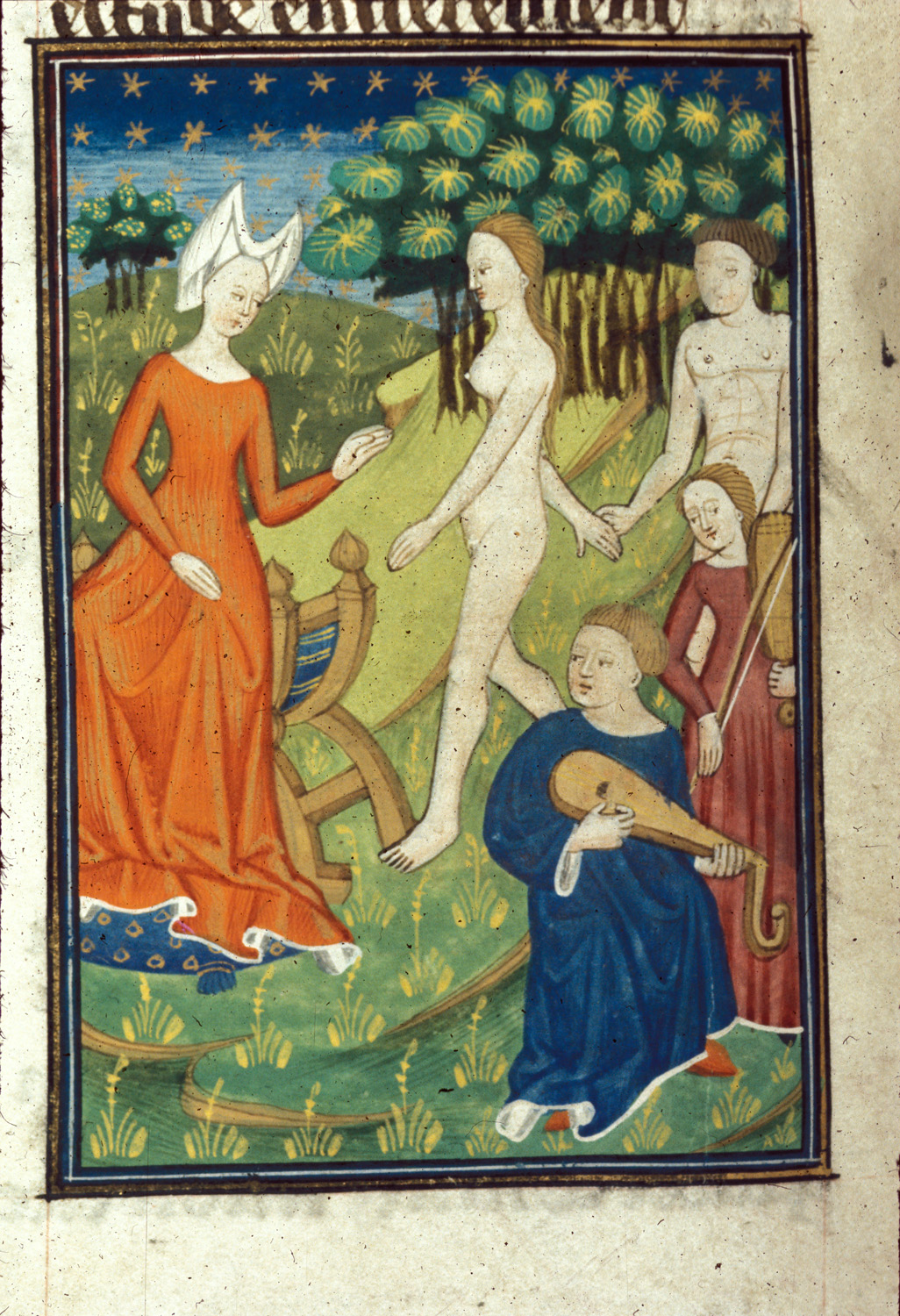 Londra, British Library, Royal 16 G V, f. 77v. Flora siede sul trono; due personaggi suonano mentre un uomo e una donna danzano nudi.