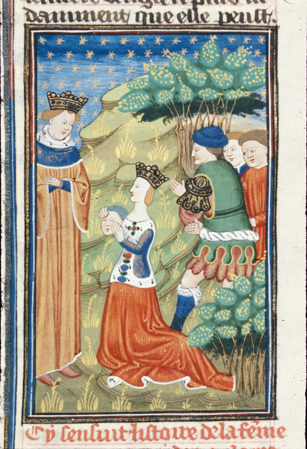 Londra, British Library, Royal 16 G V, f. 87v. La regina dei Galati offre la testa di Manlio al re suo marito.