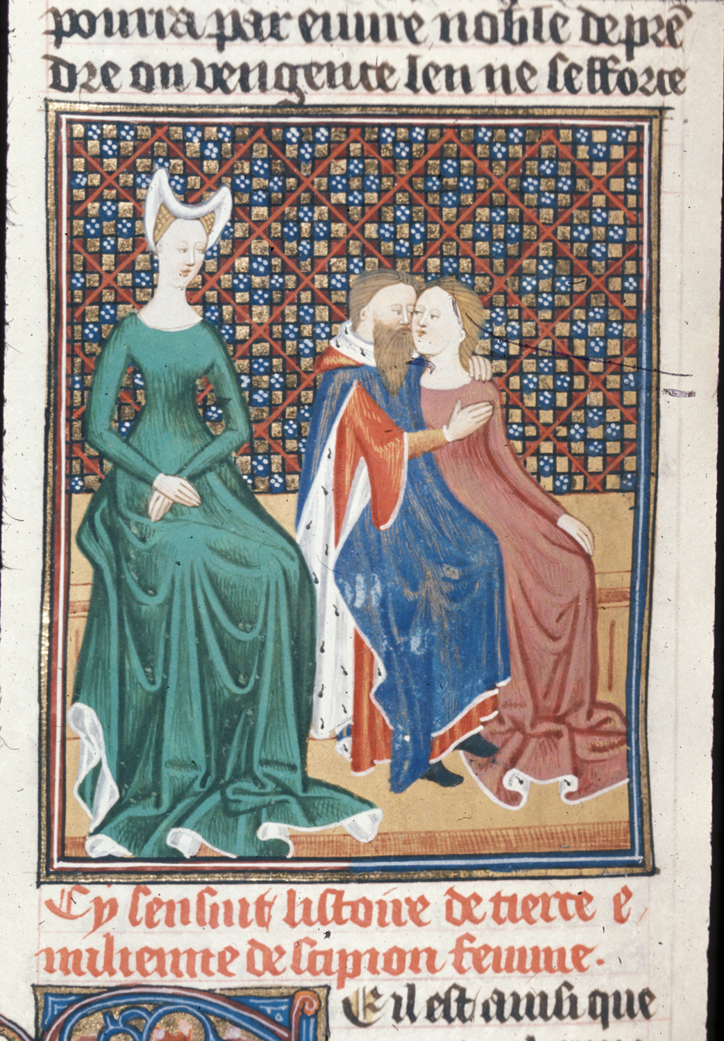 Londra, British Library, Royal 16 G V, f. 88v. Emilia Terza ignora il tradimento del marito Scipione, che bacia una giovane schiava.