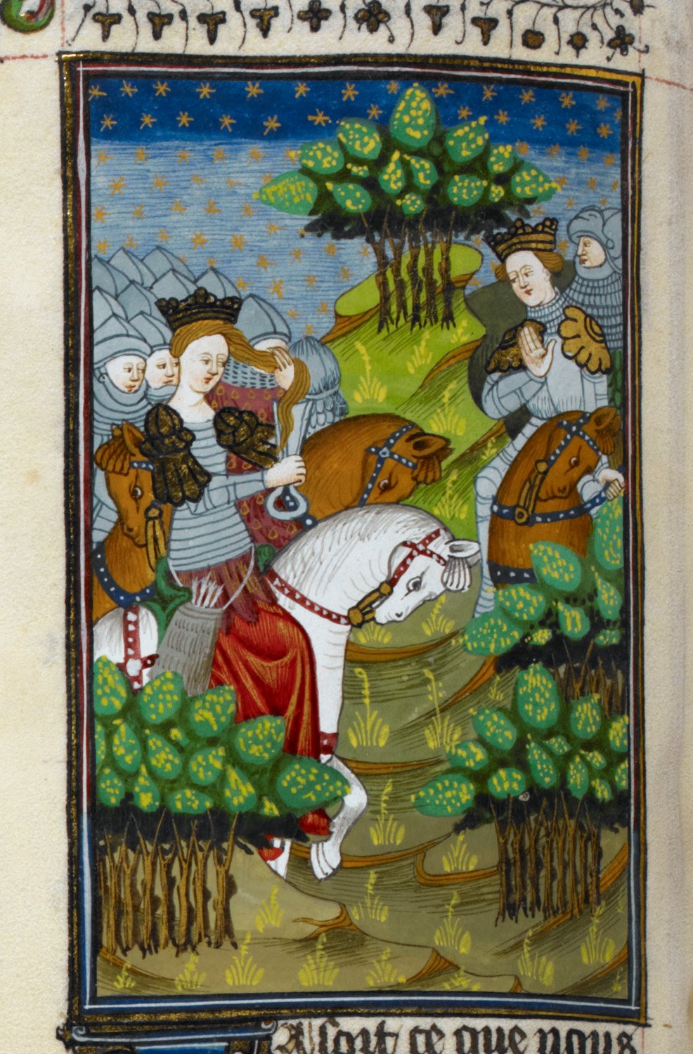 Londra, British Library, Royal 16 G V, f. 91v. Ipsicratea si taglia i capelli per affiancare Mitridate alla guida dell'esercito.