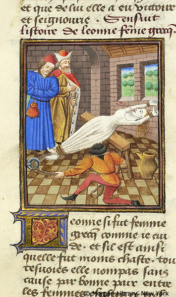New York, Pierpont Morgan Library, M 381, f. 26v. Leena subisce il supplizio per ordine di Ippia e si morde la lingua per non confessare sotto tortura.