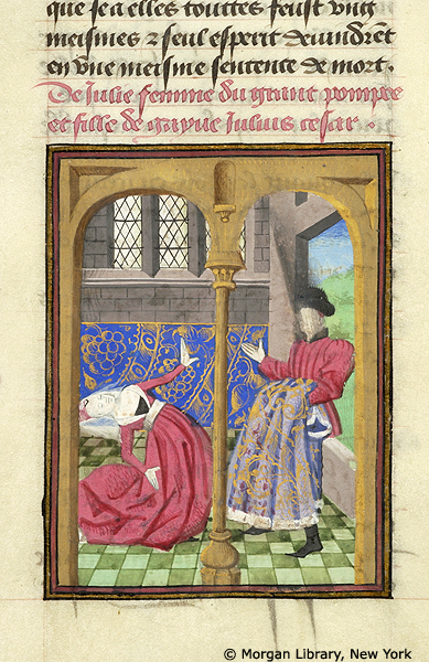 New York, Pierpont Morgan Library, M 381, f. 47r. Giulia sviene alla vista degli abiti insanguinati del marito portati da un messo.