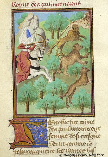 New York, Pierpont Morgan Library, M 381, f. 62r. Zenobia, regina di Palmira, si reca a caccia a cavallo in un bosco.