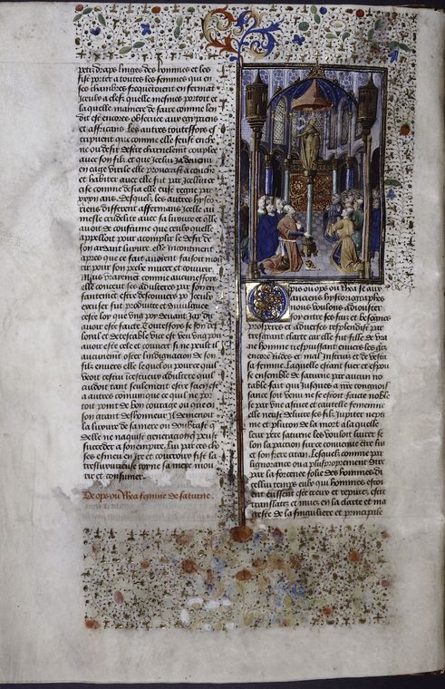 New York, Public Library, Spencer 33, f. 5v. Opi, innalzata su un piedistallo all'interno di un tempio, riceve gli omaggi di un gruppo di devoti.