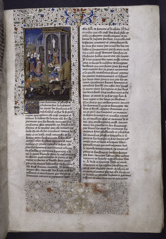 New York, Public Library, Spencer 33, f. 7r. La dea Cerere, accompagnata da tre donne, insegna ai contadini ad arare, mietere e seminare; all'interno del tempio un gruppo di fedeli rende omaggio alla statua delle dea.