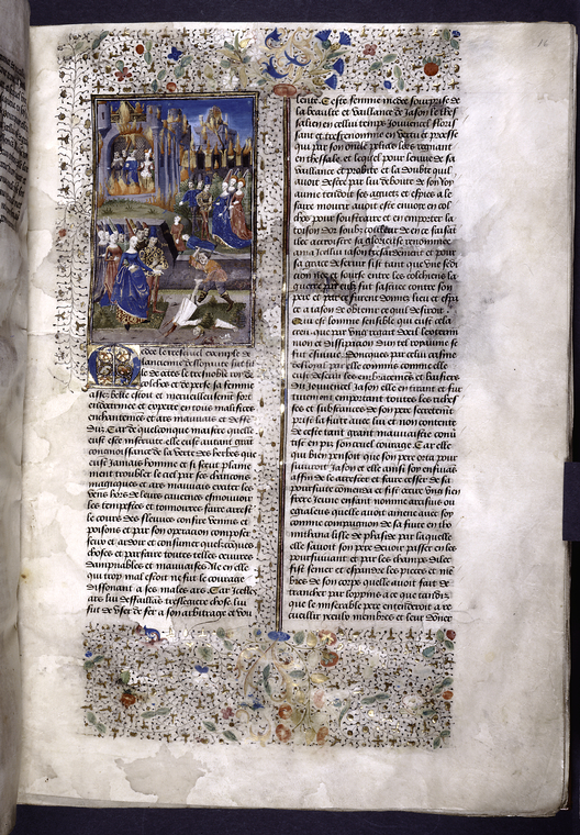 New York, Public Library, Spencer 33, f. 16r. Medea e Giasone osservano un servitore fare a pezzi Apsirto, fratello di Medea; Medea presenta a Giasone i loro figli morenti; sullo sfondo il palazzo di Creonte in fiamme, all'interno vi sono il re, Glauce e tutta la famiglia reale.