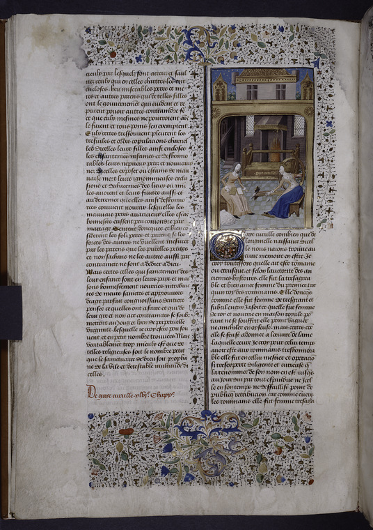 New York, Public Library, Spencer 33, f. 23v. Gaia Cirilla fila la lana in compagnia di una donna che carda.