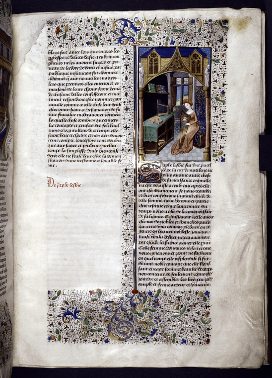 New York, Public Library, Spencer 33, f. 24r. La poetessa Saffo suona l'arpa, sul tavolo accanto sono posati un salterio e una cetra.