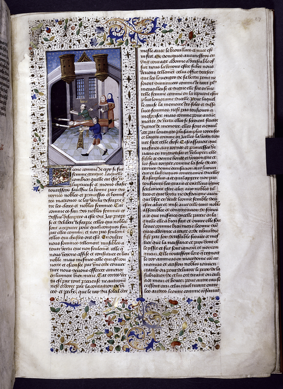 New York, Public Library, Spencer 33, f. 27r. Leena subisce il supplizio per ordine di Ippia e si morde la lingua per non confessare sotto tortura.