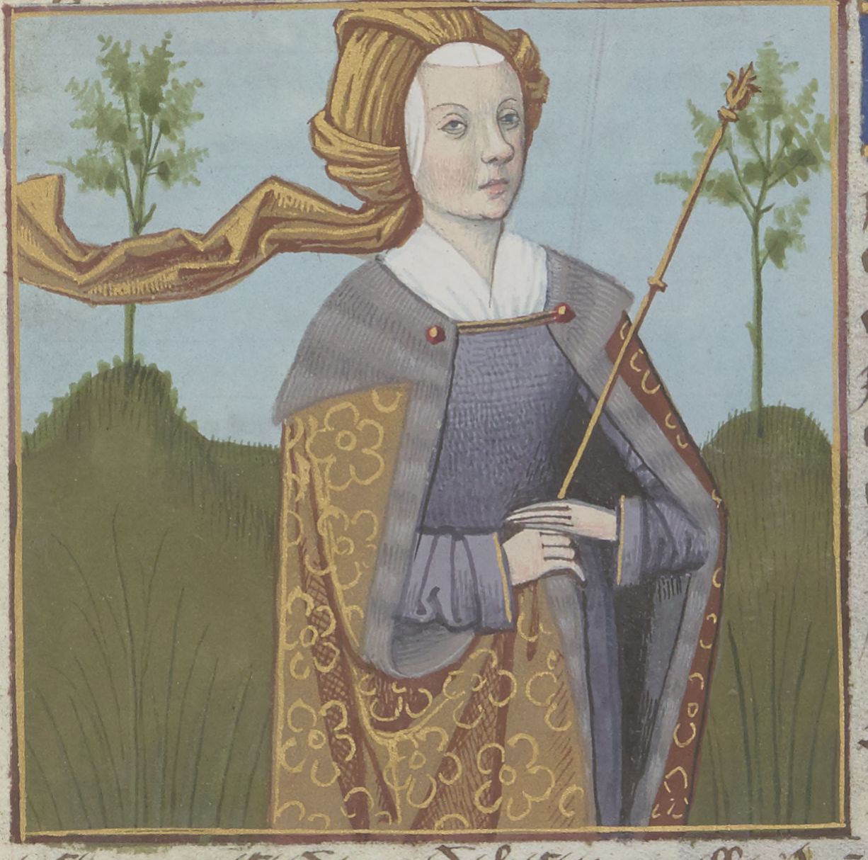 Parigi, Bibliothèque Nationale de France, Fr. 599, f. 21v. Il copista del manoscritto è Johannes Michel. La regina Giocasta con uno scettro sottile.