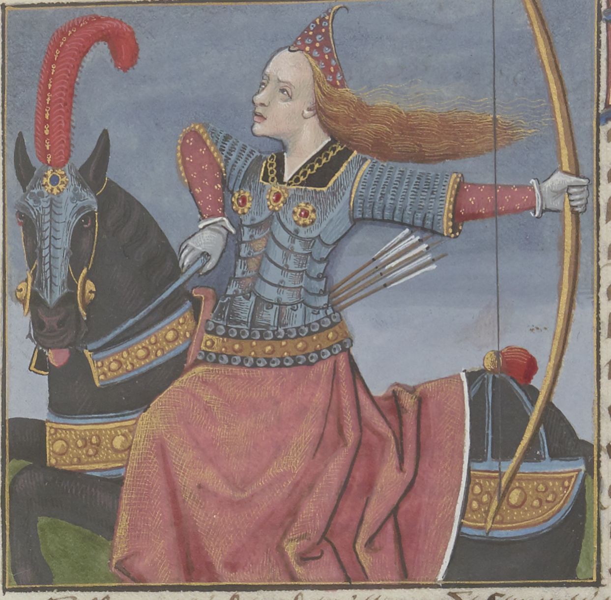 Parigi, Bibliothèque Nationale de France, Fr. 599, f. 27v. Il copista del manoscritto è Johannes Michel. Pentesilea, regina delle Amazzoni, cavalca in battaglia armata di arco e frecce.