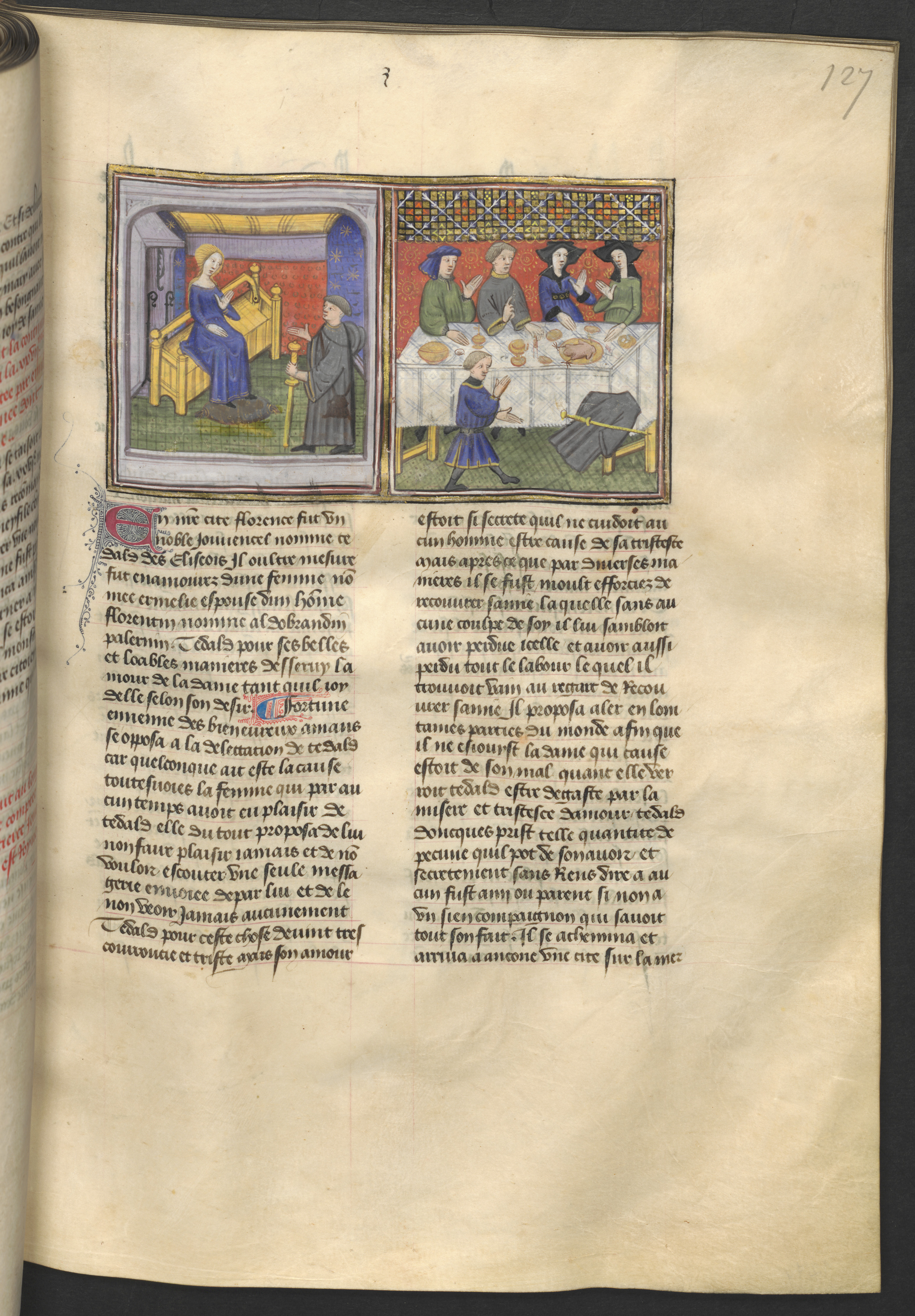 Vienna, Österreichische Nationalbibliothek, 2561, f. 127r. Tedaldo, travestito da pellegrino, spinge monna Ermellina a confessarsi; durante un banchetto Tedaldo rivela la sua vera identità.