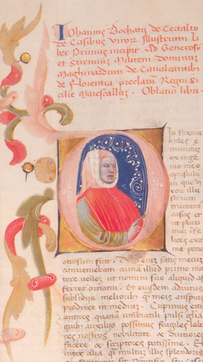 Roma, Biblioteca dell'Accademia Nazionale dei Lincei, Cors. 1717, f. 5r. Ritratto a mezzobusto dell'autore Giovanni Boccaccio, all'interno dell'iniziale figurata D(iu).