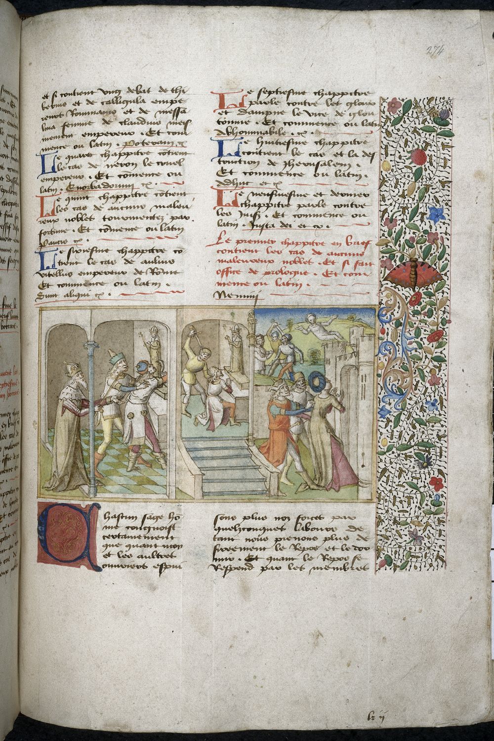 Londra, British Library, Harley 621, f. 274r. Ottaviano ordina l'uccisione di Marco Antonio, catturato mentre cerca riparo presso una statua di Giulio Cesare; Cassio Parmense viene ucciso mentre prega in un tempio dinanzi un'altra statua di Cesare; Giulia viene esiliata dalla città; due uomini armati avanzano verso Agrippa, figlio di Giulia, la quale giace ebbra in un prato.