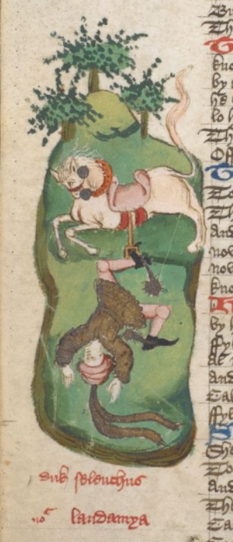 Londra, British Library, Harley 1766, f. 153v. Seleuco cade da cavallo.