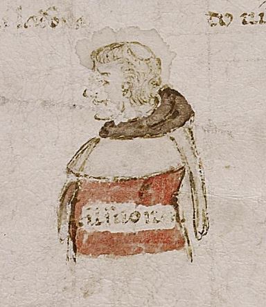 Berlino, Staatsbibliothek – Preußischer Kulturbesitz, Hamilton 90, f. 87v. Manoscritto autografo di Giovanni Boccaccio. Busto dello scolaro Rinieri, in corrispondenza del richiamo "al suono".