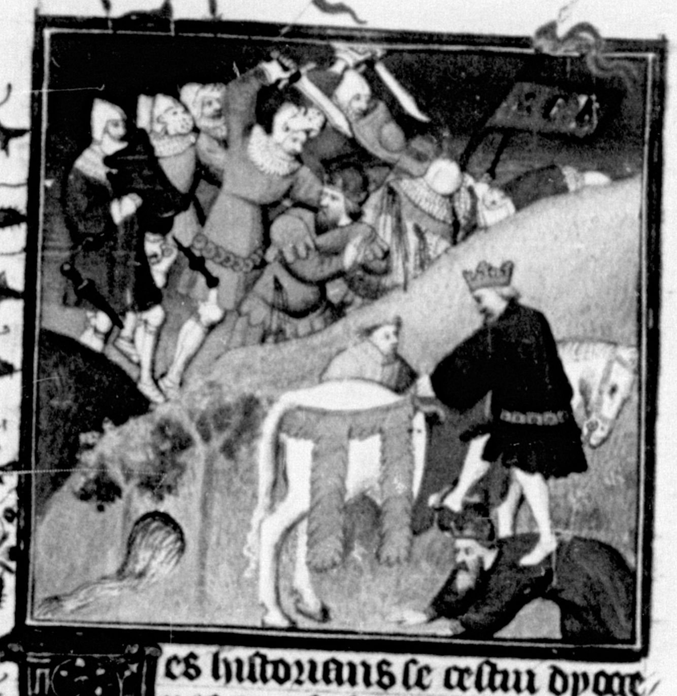 Parigi, Bibliothèque Nationale de France, Fr. 226, f. 256r. Diogene viene sconfitto in battaglia; Belzet monta a cavallo usando la schiena di Diogene come predellino.