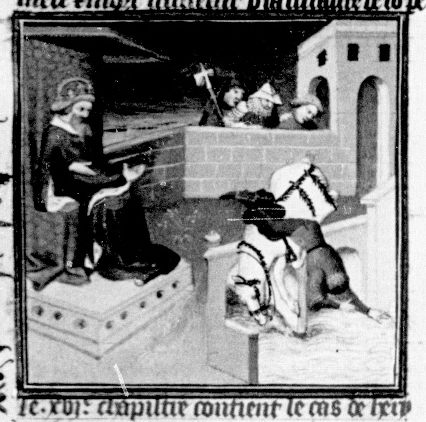 Parigi, Bibliothèque Nationale de France, Fr. 226, f. 260v. Arrigo precipita da un ponte con il suo cavallo; tre personaggi assistono alla scena; Federico II di Svevia (?) seduto sul trono.