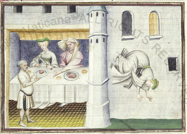 Maestro della Cité des Dames (1414-1419), Guiglielmo Rossiglione fa servire alla moglie il cuore di Guardastagno; la donna si getta dalla finestra