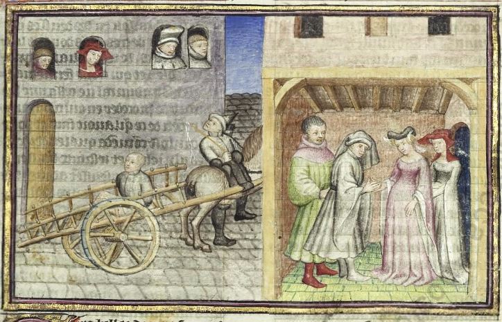 Città del Vaticano, Biblioteca Apostolica Vaticana, Pal. lat. 1989, f. 168v. Il copista del manoscritto, datato 15 giugno 1414, è Laurent de Premierfait. Teodoro viene condotto al luogo del supplizio legato su di un carro; Teodoro sposa Violante.