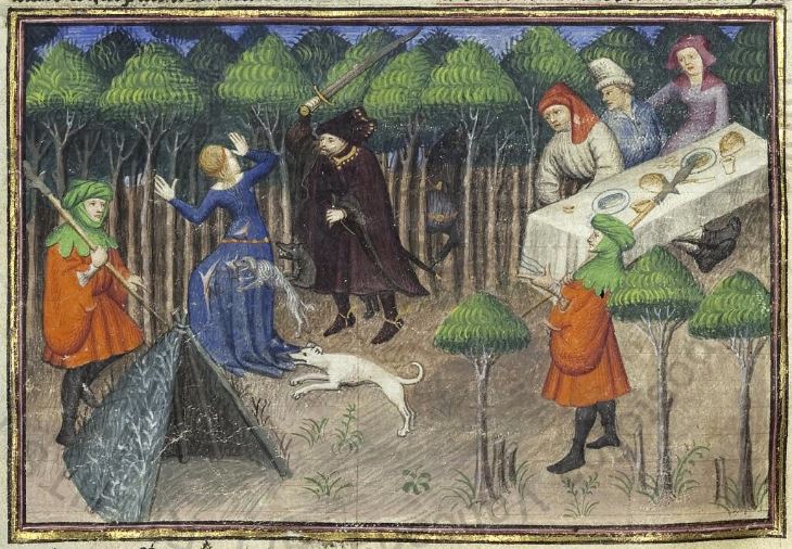 Città del Vaticano, Biblioteca Apostolica Vaticana, Pal. lat. 1989, f. 171v. Il copista del manoscritto, datato 15 giugno 1414, è Laurent de Premierfait. Nastagio degli Onesti ha una visione nel bosco di una donna aggredita da un cavaliere in nero e una muta di cani; Nastagio allestisce un banchetto nel bosco per mostrare ai commensali la medesima visione.