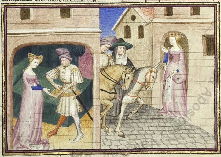 Maestro della Cité des Dames (1414-1419), Nonna de' Pulci riceve fiorini falsi; la donna motteggia il vescovo e messer Della Ratta