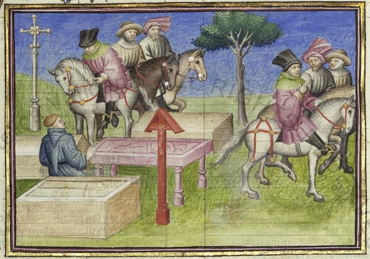 Città del Vaticano, Biblioteca Apostolica Vaticana, Pal. lat. 1989, f. 193v. Il copista del manoscritto, datato 15 giugno 1414, è Laurent de Premierfait. Betto Brunelleschi e la sua brigata si fermano a conversare con Guido Cavalcanti al cimitero di San Giovanni; allontanandosi a cavallo, Betto spiega ai suoi amici le parole di Guido.