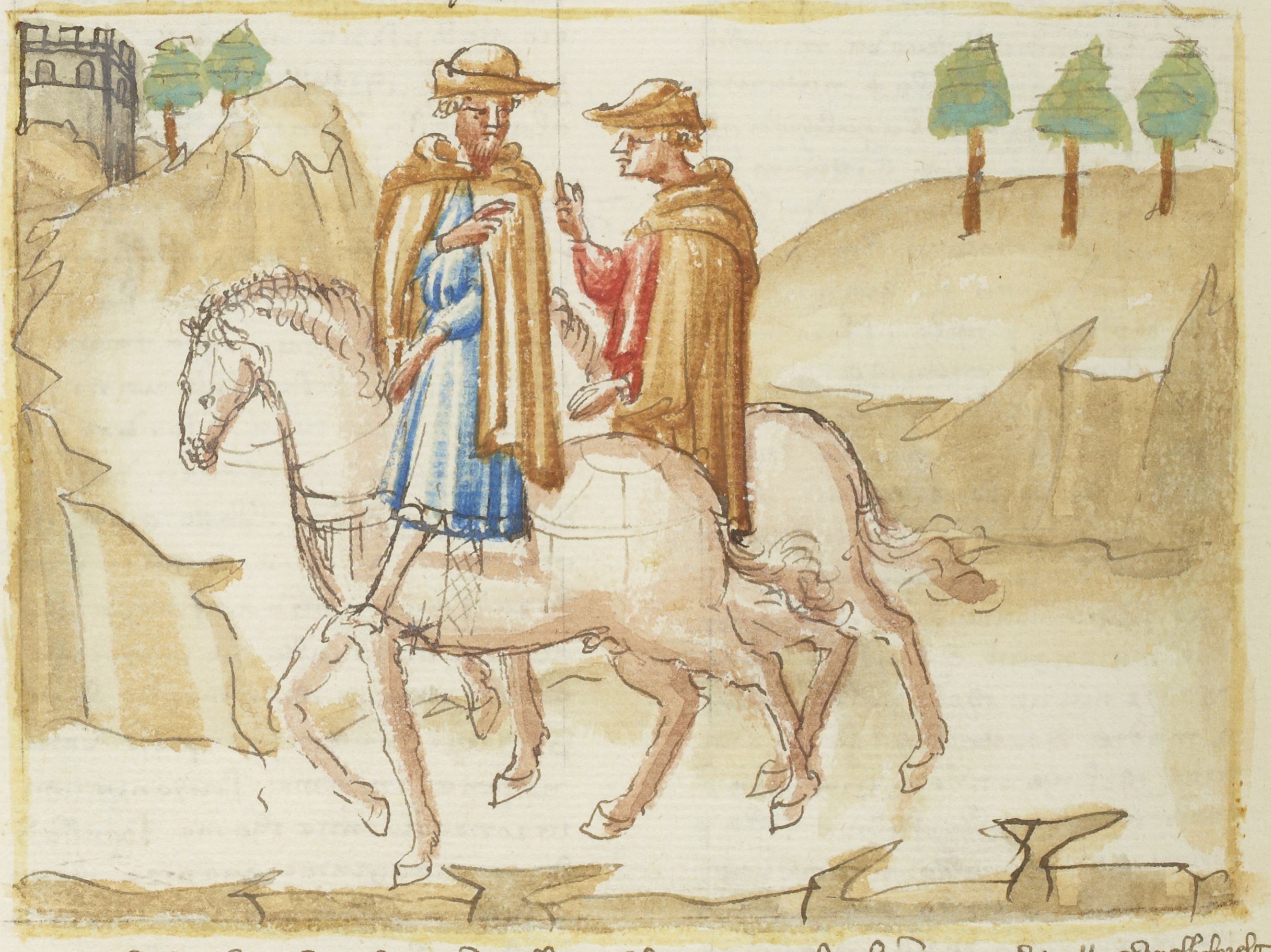 Parigi, Bibliothèque Nationale de France, It. 63, f. 200v. Il copista del manoscritto, datato 10 ottobre 1427, è Ludovico di Salvestro Ceffini. Giotto e Forese da Rabatta cavalcano insieme discutendo.