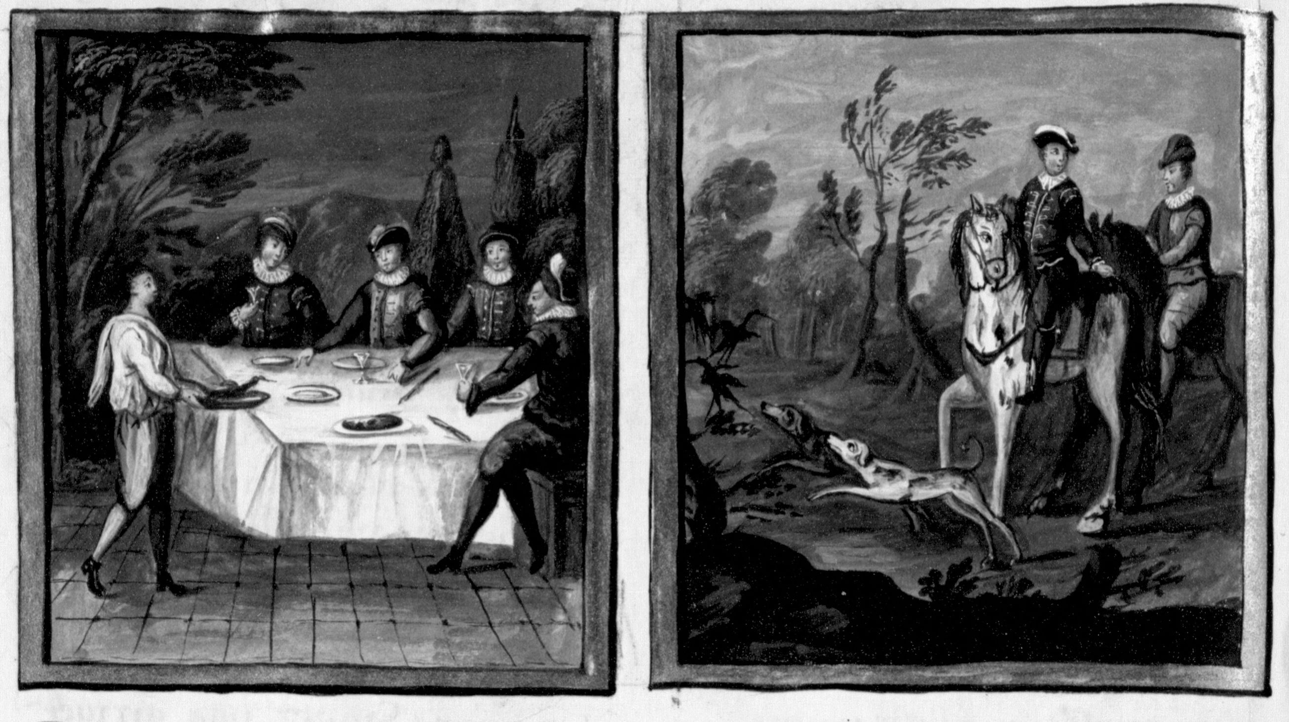 Miniatore francese (XVII secolo), Chichibio serve la gru al tavolo dei nobili; Chichibio e Currado osservano le gru