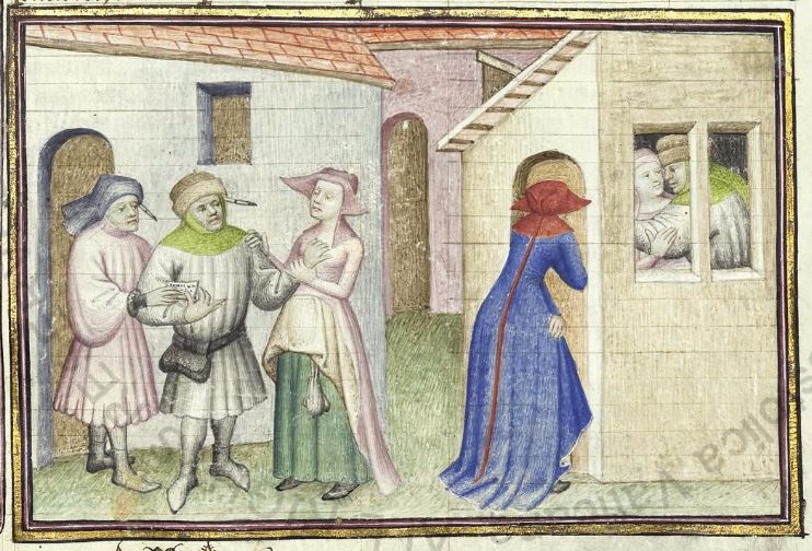 Maestro della Cité des Dames (1414-1419), Bruno consegna a Calandrino una pergamena per la pozione d'amore; la moglie di Calandrino sorprende il marito con Niccolosa