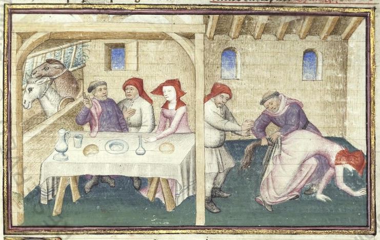 Città del Vaticano, Biblioteca Apostolica Vaticana, Pal. lat. 1989, f. 287r. Il copista del manoscritto, datato 15 giugno 1414, è Laurent de Premierfait. Donno Gianni di Barolo siede a tavola con Pietro da Tresanti e sua moglie; Pietro interrompe donno Gianni mentre questi tenta di attaccare la coda di cavallo alla donna.