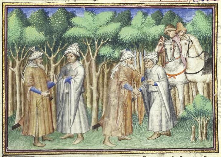 Città del Vaticano, Biblioteca Apostolica Vaticana, Pal. lat. 1989, f. 293v. Il copista del manoscritto, datato 15 giugno 1414, è Laurent de Premierfait. Mitridanes incontra Natan nel bosco; Mitridanes rinuncia ad uccidere Natan e i due uomini stringono amicizia.