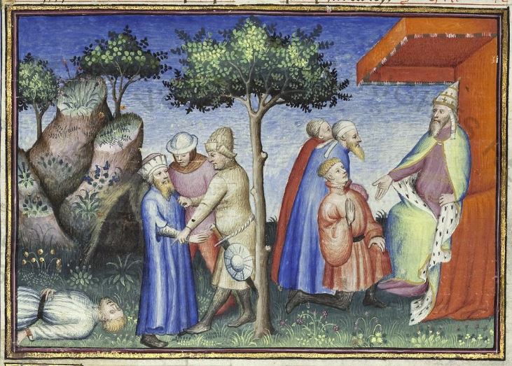 Città del Vaticano, Biblioteca Apostolica Vaticana, Pal. lat. 1989, f. 307r. Il copista del manoscritto, datato 15 giugno 1414, è Laurent de Premierfait. Gisippo viene ingiustamente accusato di omicidio ed arrestato; Gisippo, Tito e l'omicida confessano dinanzi al giudice Varrone.