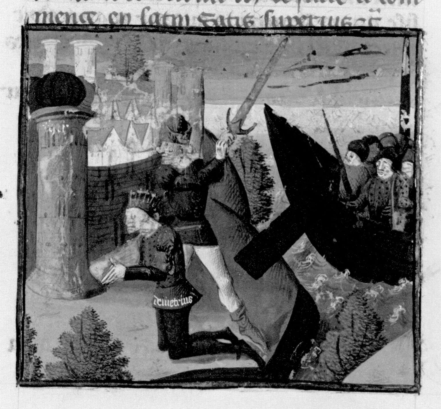 Parigi, Bibliothèque Nationale de France, Fr. 230, f. 150r. Il copista del manoscritto è P. Droulin. Demetrio viene decapitato appena giunto sulle coste di Tiro.