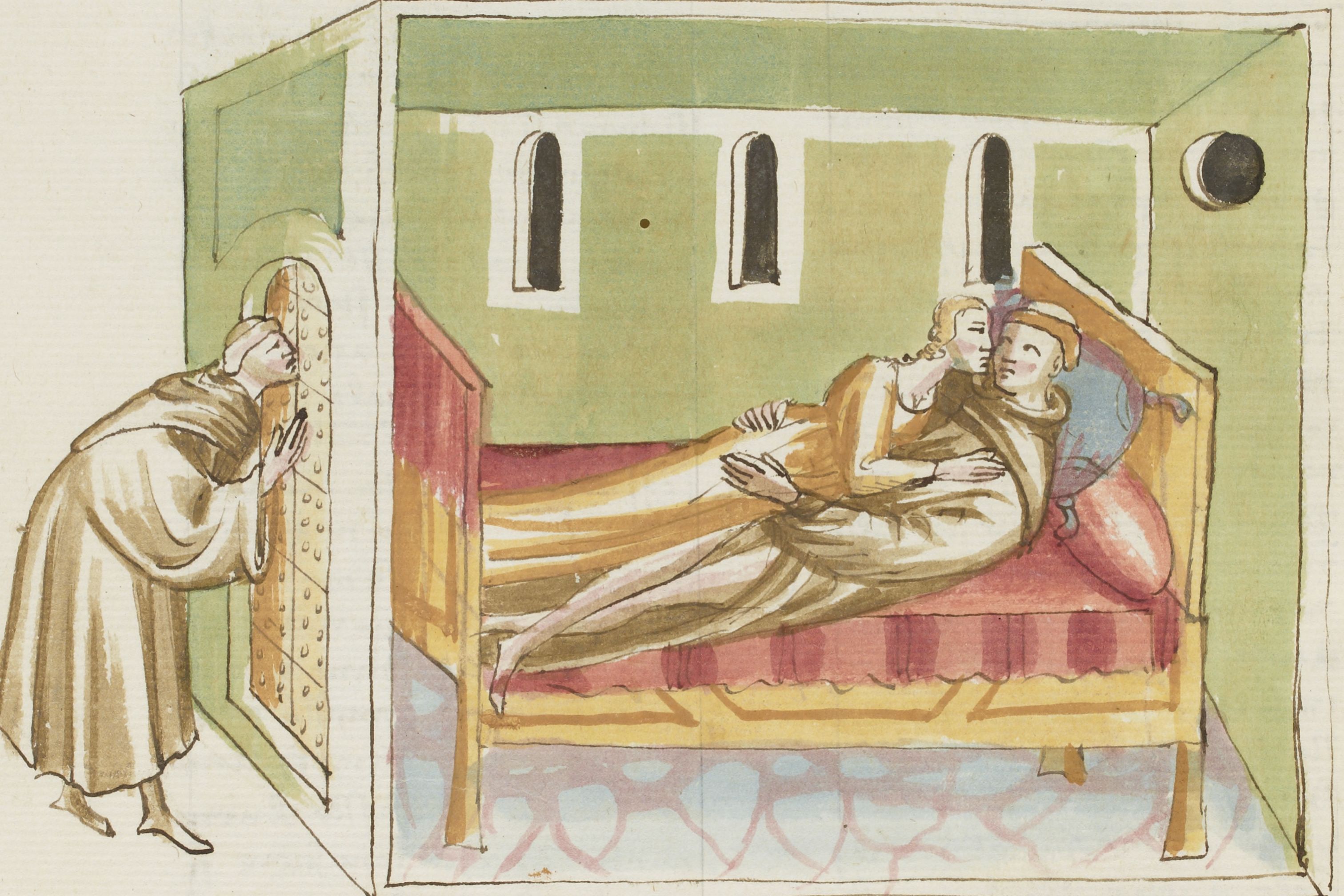 Parigi, Bibliothèque Nationale de France, It. 63, f. 20v. Il copista del manoscritto, datato 10 ottobre 1427, è Ludovico di Salvestro Ceffini. L'abate sorprende un giovane monaco peccare di lussuria con una donna nella sua cella.