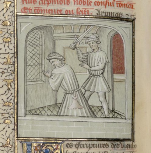 Parigi, Bibliothèque interuniversitaire Sainte-Geneviève, 1128, f. 201v. Gaio Mario si fa uccidere dal suo schiavo.