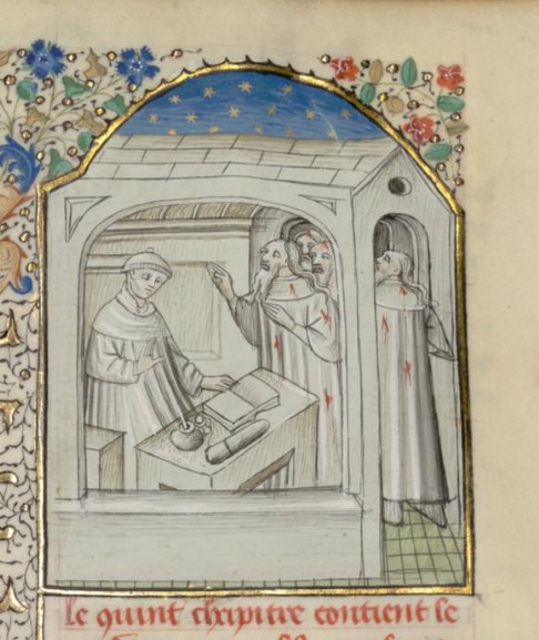 Parigi, Bibliothèque interuniversitaire Sainte-Geneviève, 1128, f. 256r. Giovanni Boccaccio incontra un gruppo di sfortunati coperti di ferite.