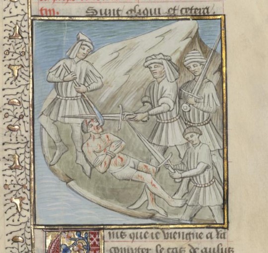 Parigi, Bibliothèque interuniversitaire Sainte-Geneviève, 1128, f. 257r. Tre uomini uccidono l'imperatore Vitellio e lo trascinano con un uncino per il naso per gettarlo nel Tevere.