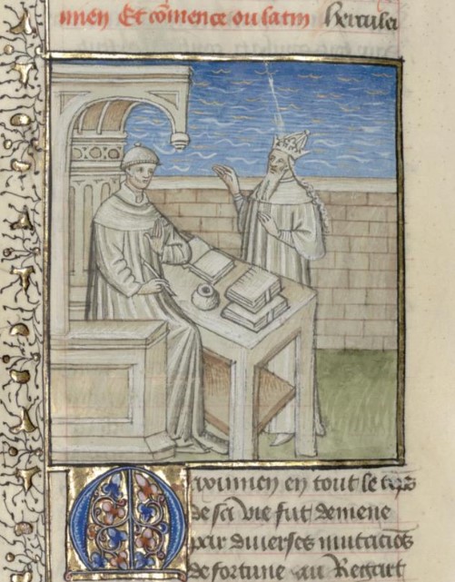 Parigi, Bibliothèque interuniversitaire Sainte-Geneviève, 1128, f. 283v. Massimiano Erculio appare a Giovanni Boccaccio.