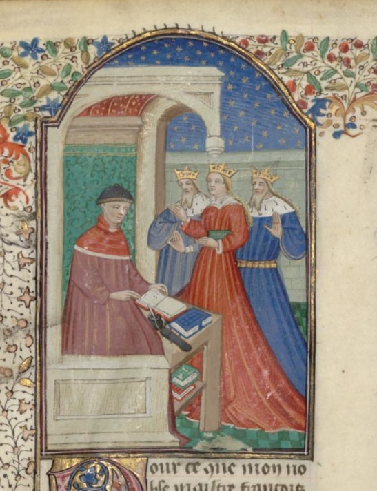 Parigi, Bibliothèque interuniversitaire Sainte-Geneviève, 1128, f. 312v. Giovanni Boccaccio incontra un gruppo di sfortunati.